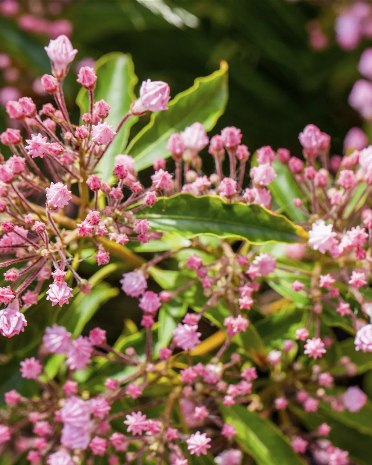 Der Berglorbeer bildet rosafarbene Blüten von Mai bis Juni.