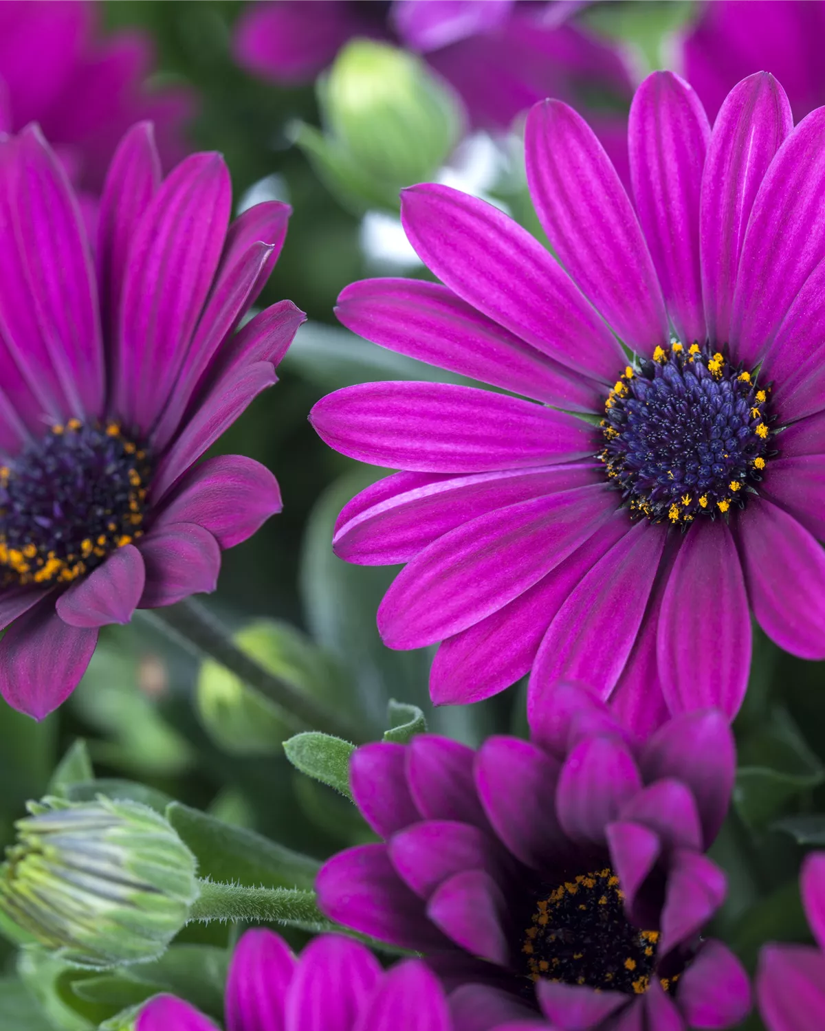Je nach Sorte, bildet Osteospermum ecklonis Blüten in verschiedenen Farben zwischen Mai und November. Die bis zu 8 cm großen Blüten sind körbchenartig.