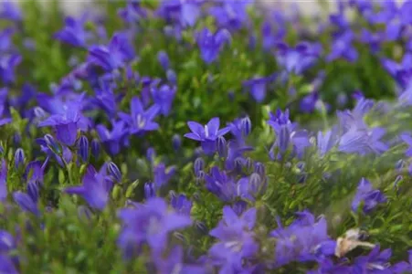 Wie funkelnde Sterne erstrahlen die violetten Blüten der Dalmatiner Polster-Glockenblume. Die Pflanze ist robust und langlebig. Dichte Polster schaffen bunte Farbtupfer. Die Blütezeit liegt zwischen Juni und August. Bei der Standortwahl lässt Ihnen die genügsame Pflanze freie Hand. Sonne wird ebenso vertragen wie Schatten oder längere Trockenheit. Auch im Kübel fühlt sich die aus Kroatien stammende Pflanze wohl. Im Herbst zieht sich die Dalmatiner Polster-Glockenblume zum Überwintern in den Boden zurück.