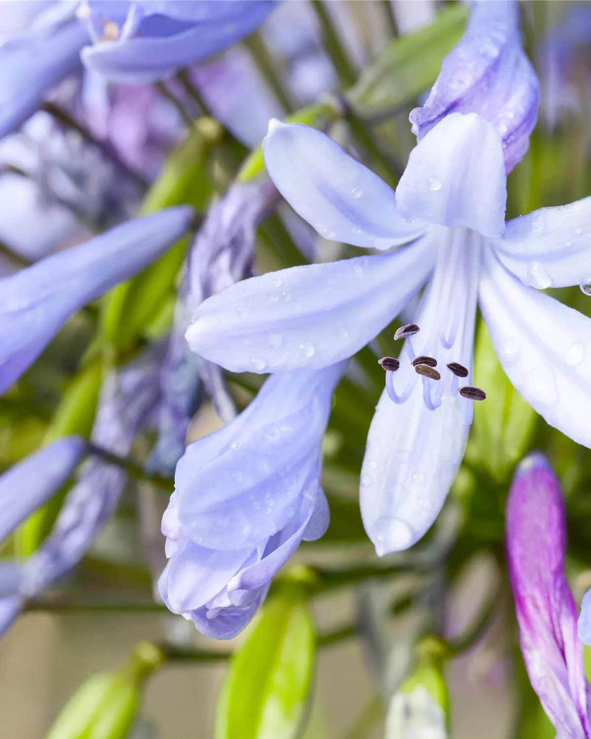 Je nach Sorte, bildet Agapanthus africanus Blüten in verschiedenen Farben zwischen Juni und September. Die Blüten sind sternförmig.