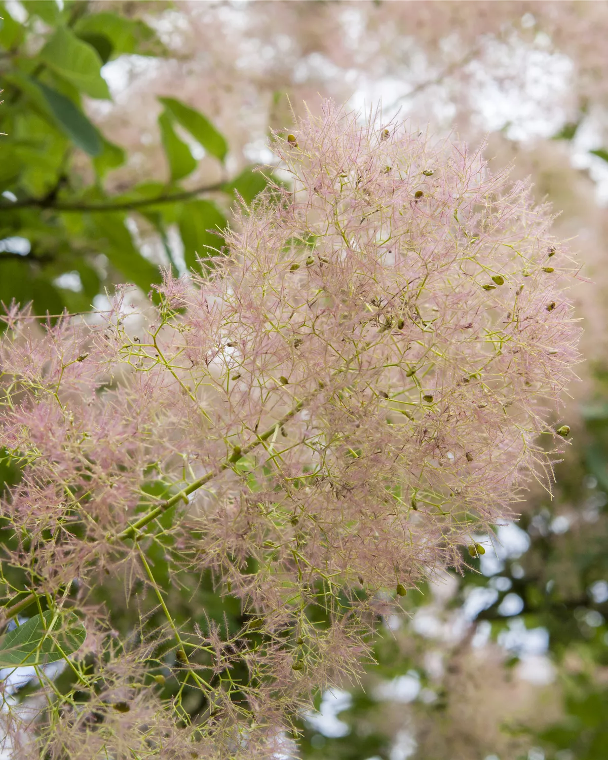 Der Perückenstrauch (Cotinus coggygria) blüht von Juni bis Juli mit gelb-grünen Blüten. Dieses ausladend wachsende Laubgehölz erreicht eine Höhe von ca. 3 m und eine Breite von ca. 2 m. Der Perückenstrauch ist gut frostverträglich.